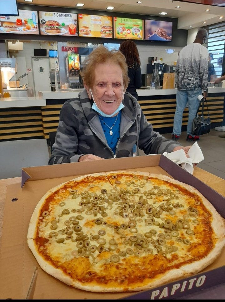 Un token que se agrega al proceso electrónico de vibrar recordándola. Está también la foto con mi hija, su bisnieta, en el último viaje que hizo a Argentina. Y la foto que le sacó mi mamá en el último viaje que disfrutaron en Israel, la cara de felicidad desbordante sonriendo con unos ojos celestes eternos frente a una pizza pantagruélica en el patio de comidas del Kenyon.
